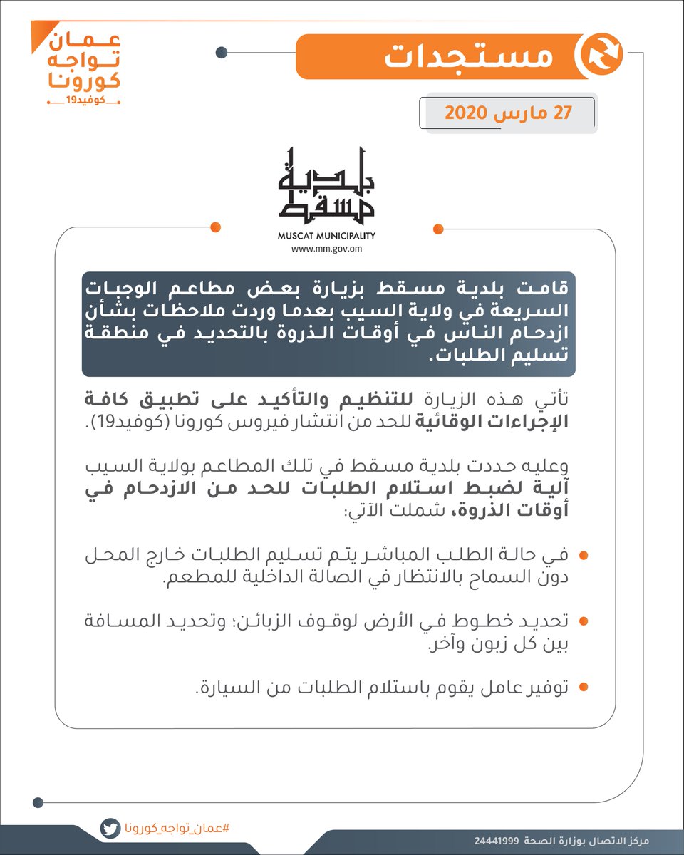 ع مان تواجه كورونا A Twitteren بلدية مسقط تقوم بزيارة بعض مطاعم الوجبات السريعة في ولاية السيب للتنظيم والتأكيد على تطبيق الإجراءات الوقائية عمان تواجه كورونا Https T Co Y4fkolrfoq